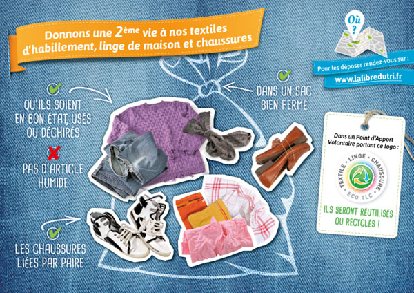Qu’ils soient trop petits, trop grands, démodés, usés, déchirés ou même tâchés, une seconde vie attend tous vos « TLC » : comprenez « Textiles d’habillement / Linge de maison / Chaussures ». Pour ce faire, un impératif tout simple : les déposer au bon endroit !!